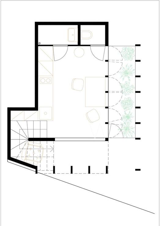 přízemím a zahradou skrz rotující schodiště zakuklené do botníků